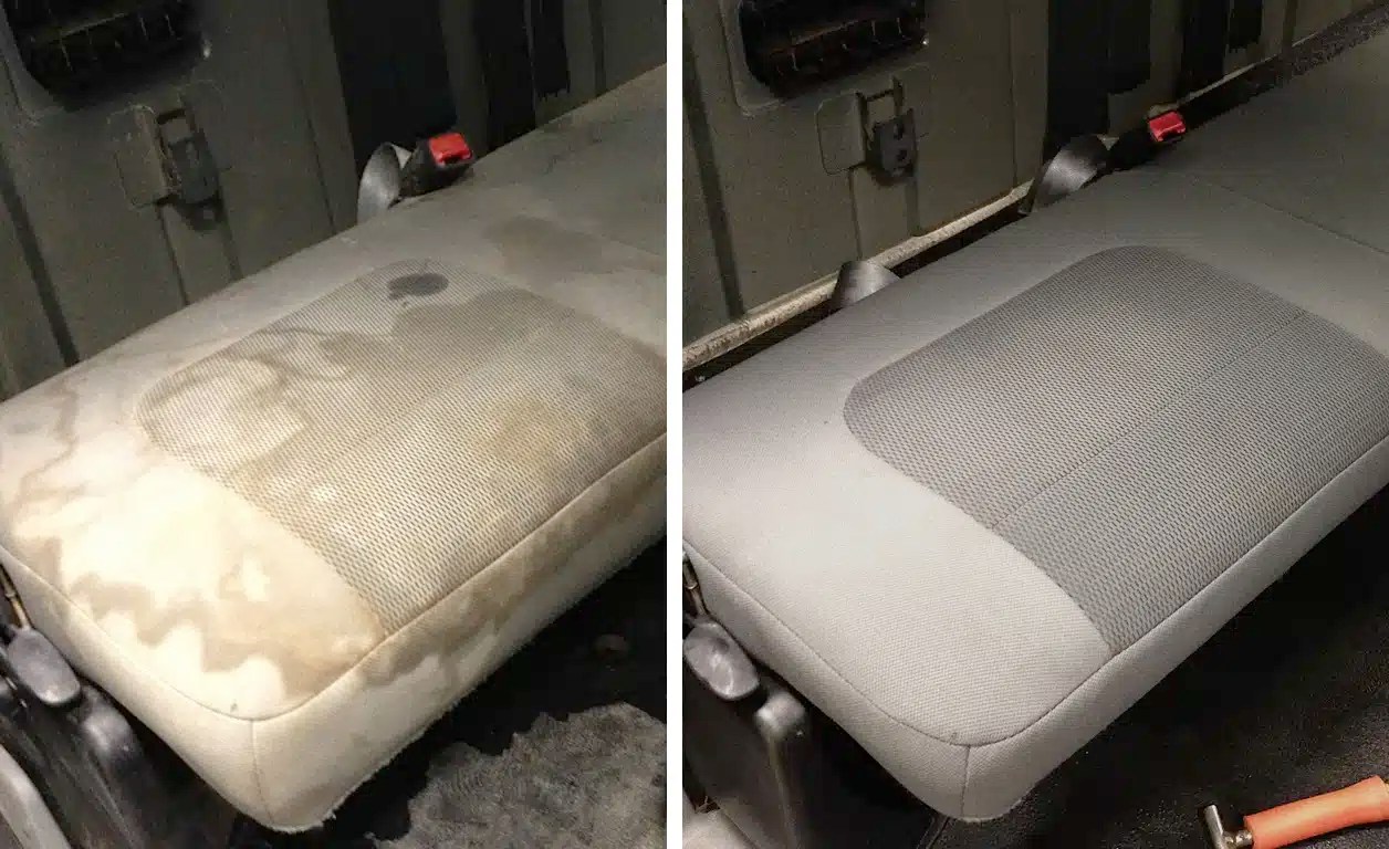 Tough stains on seats or carpets are treated using targeted stain removers and extraction tools to lift grime without damaging the fabric.